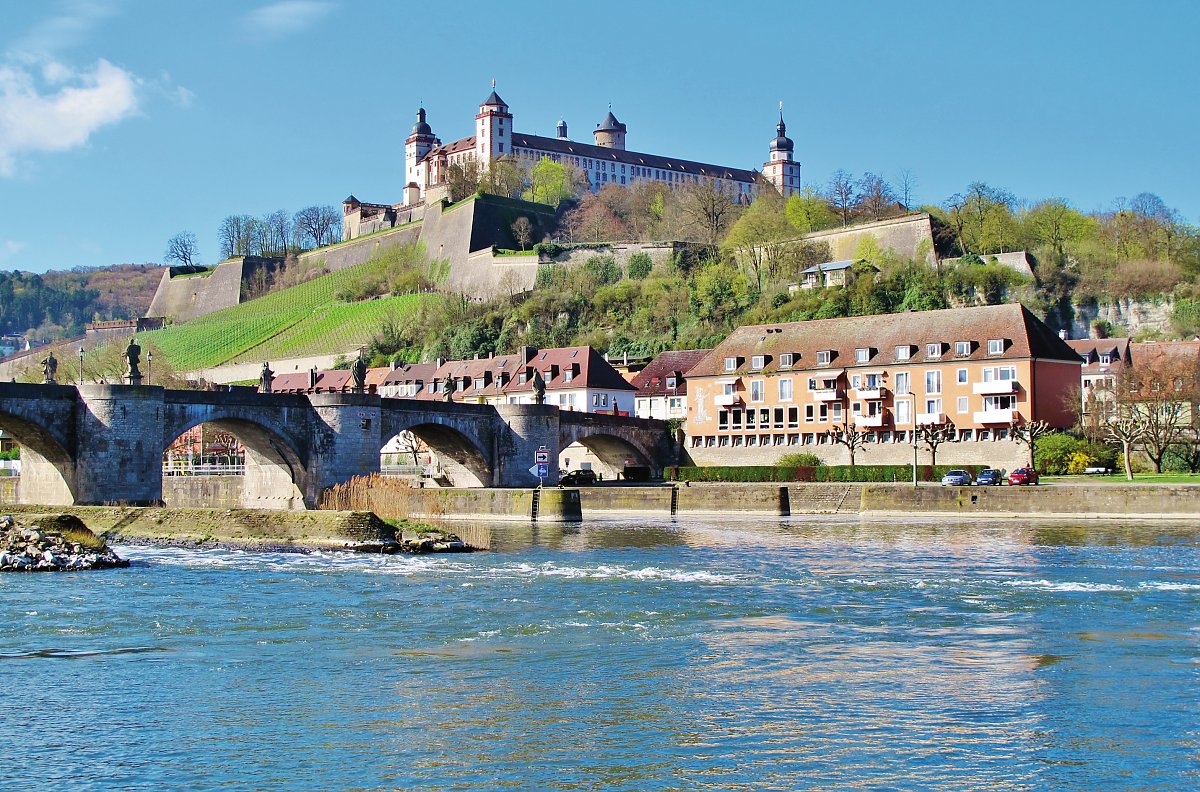 Stadt zu beiden Seiten des Mains: Baudenkmäler von Rang, großzügige Parkanlagen, rebenbewachsene Hänge, weithin sichtbar die Festung Marienberg, das Turm-Ensemble vom Kiliansdom, Neumünster und Marienkapelle. Im Herzen der Stadt sehen Sie die ehemals fürstbischöfliche Residenz, barocker Prunkbau und Meisterwerk Balthasar Neumanns.